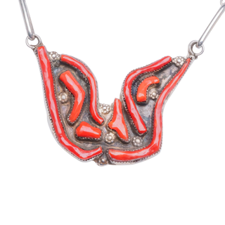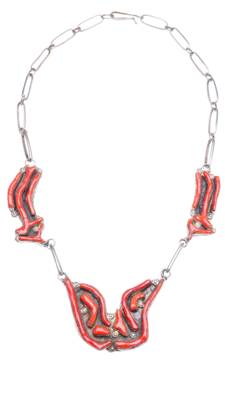 Experience wearable artistry with this unique coral necklace created by skilled artisans Griffin & Vangie Tsabetsaye. Meticulously handcrafted, this necklace features an innovative and abstract design, highlighting the vibrant hues of coral in a distinctive arrangement. With their creative approach and expert craftsmanship, the Tsabetsaye's transform coral into a wearable masterpiece that defies convention and celebrates individuality.