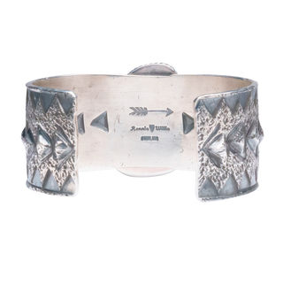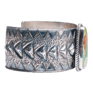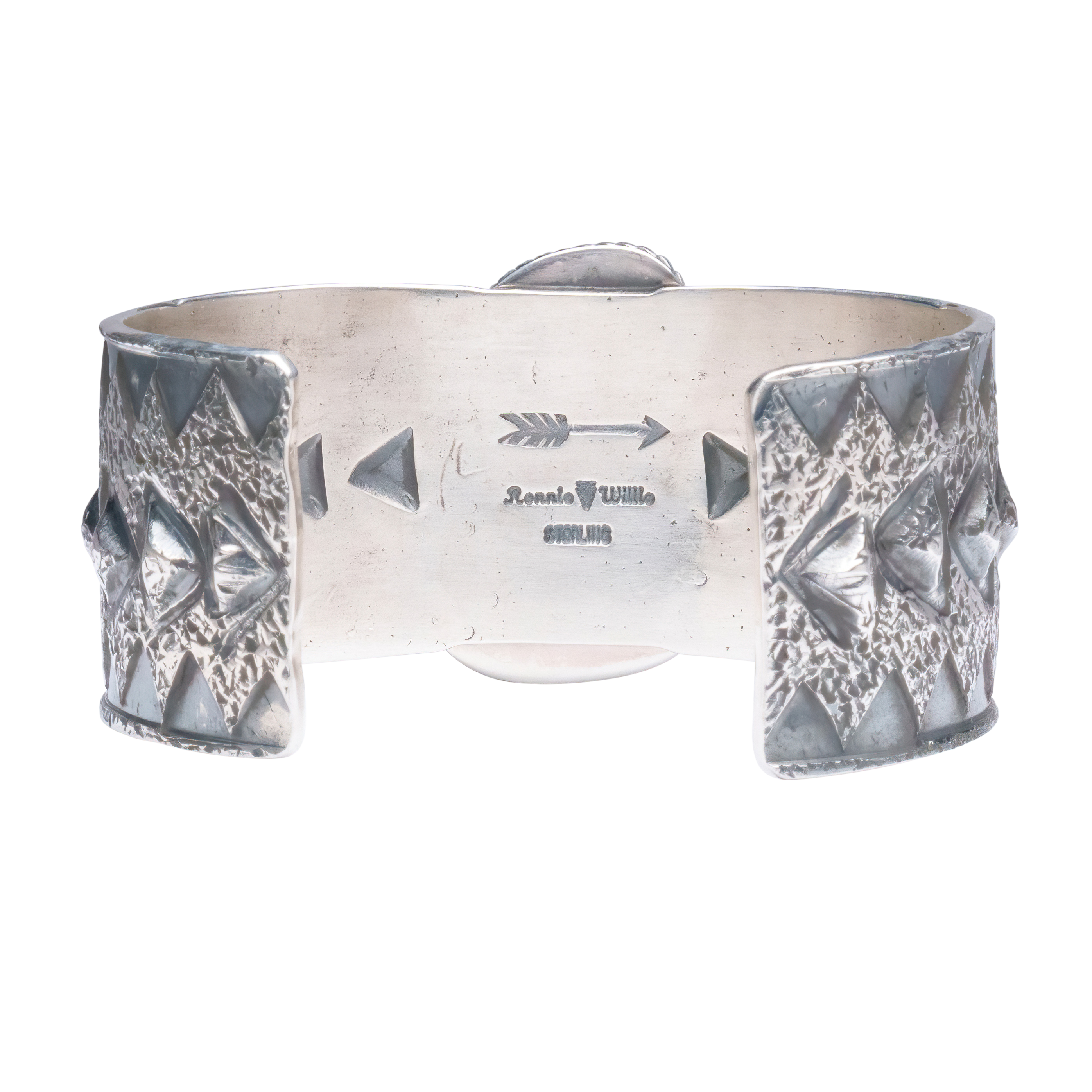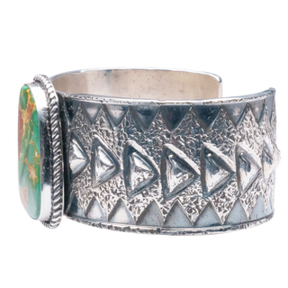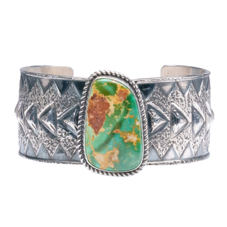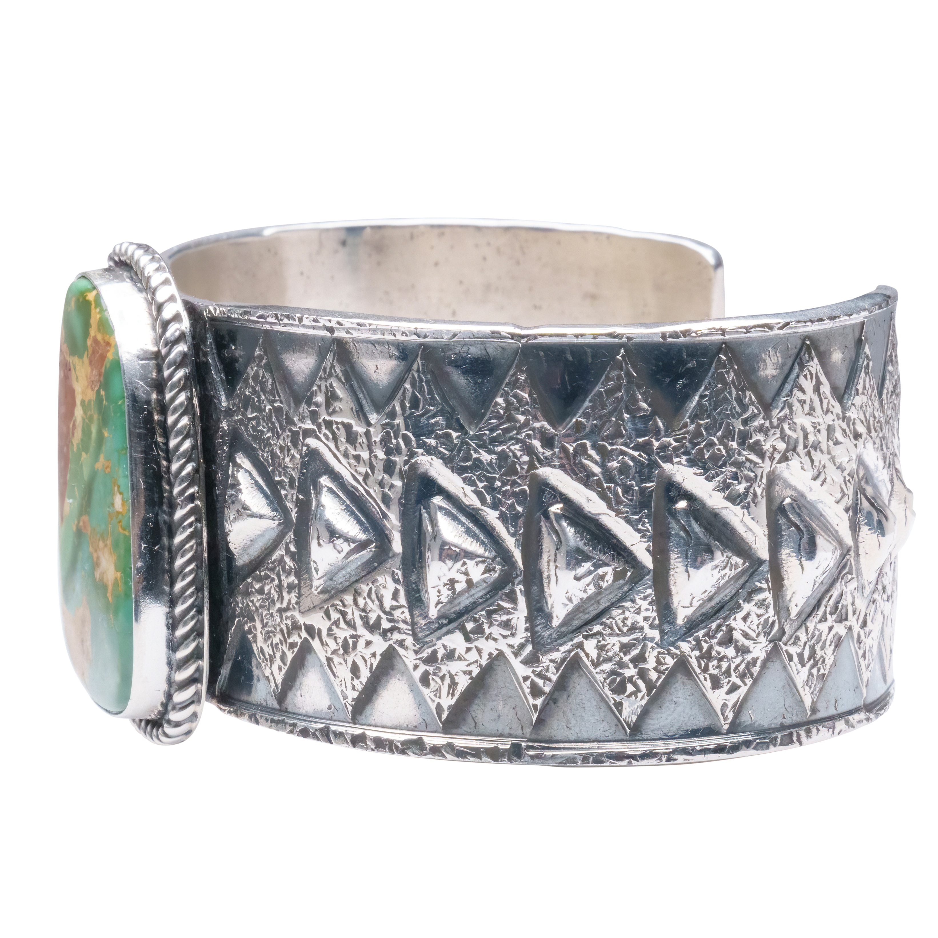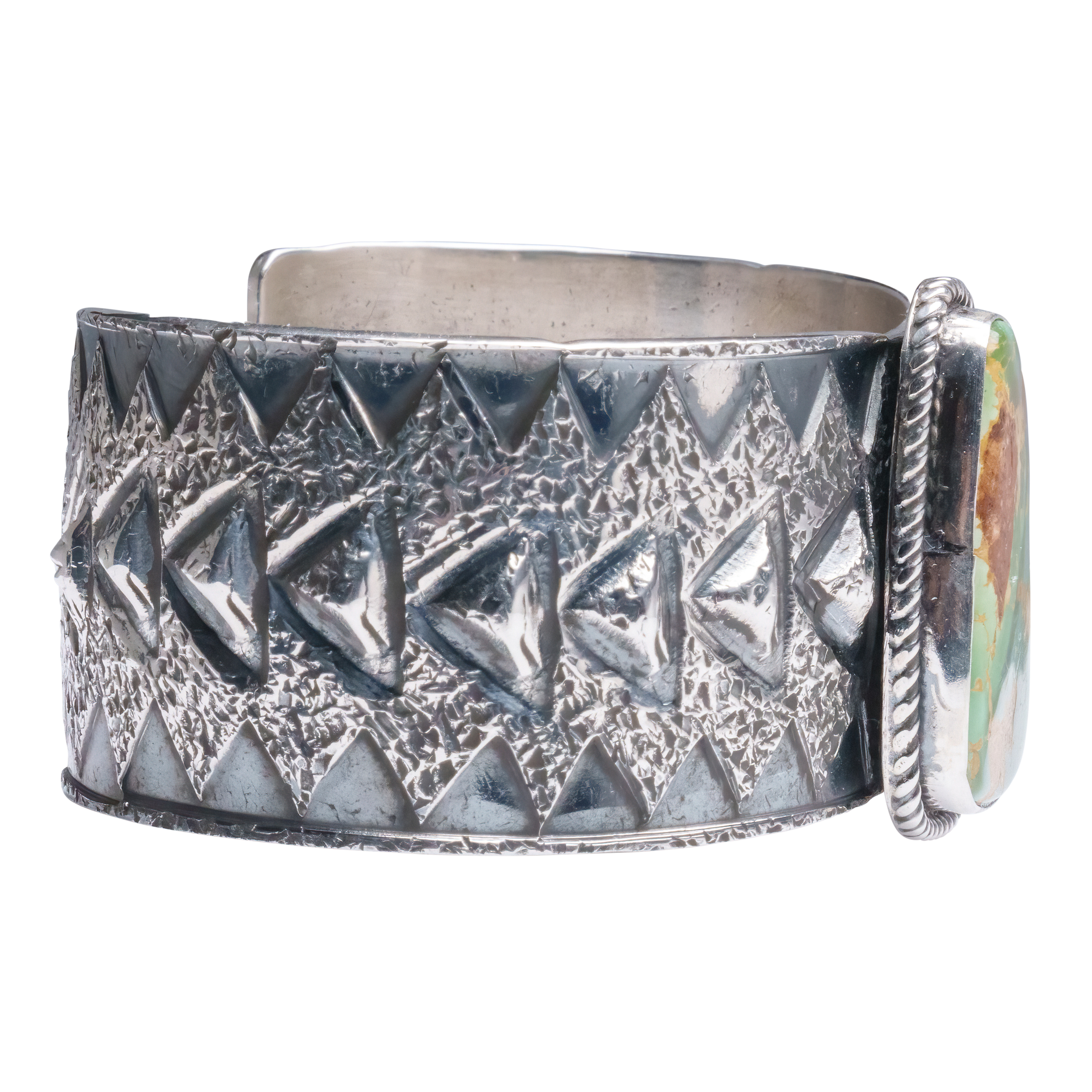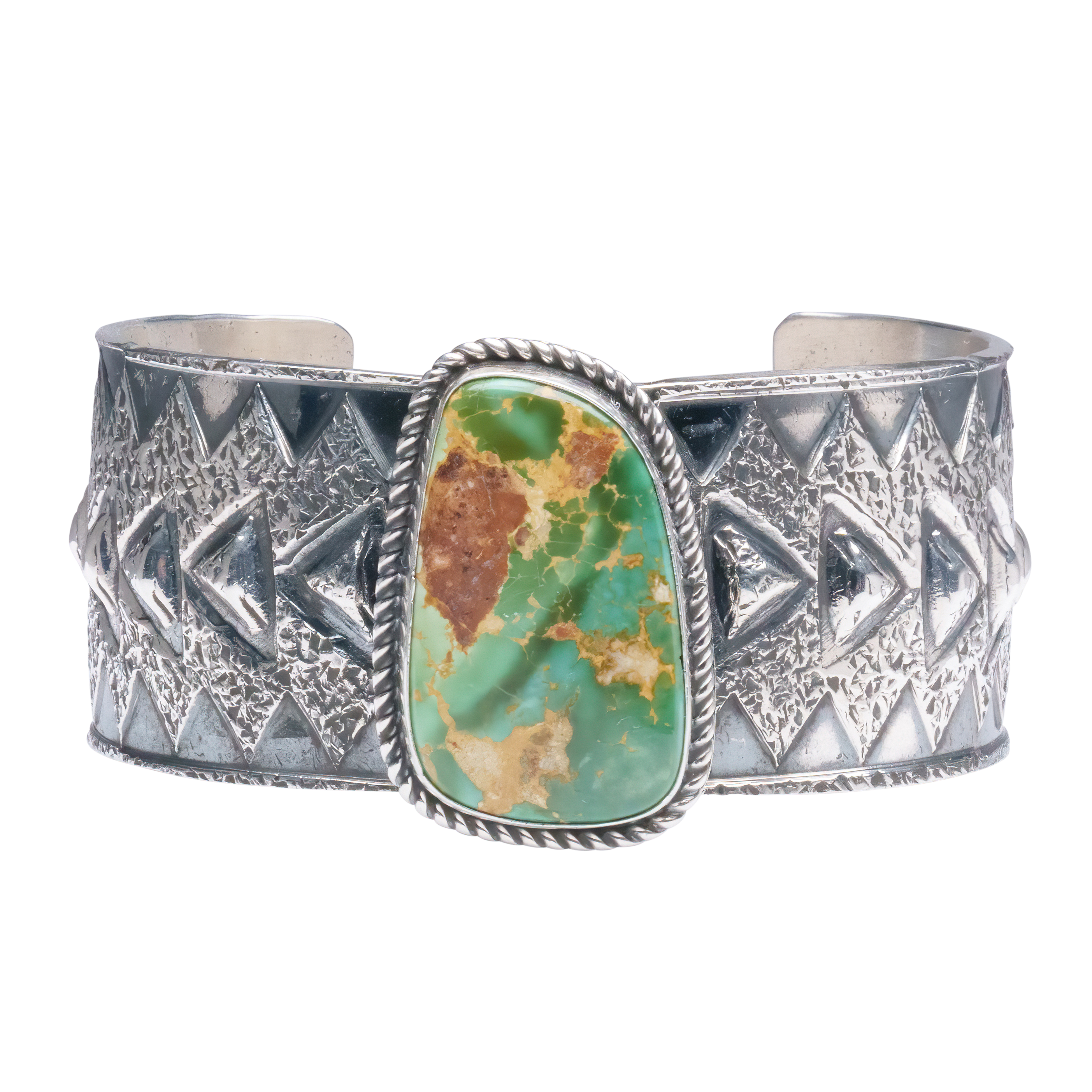 This striking cuff handcrafted by jeweler Ronnie Willie features a stunning emerald green Royston turquoise stone as its focal point, encircled by a sterling silver rope-style bezel and a gorgeous hand-sculpted band.
