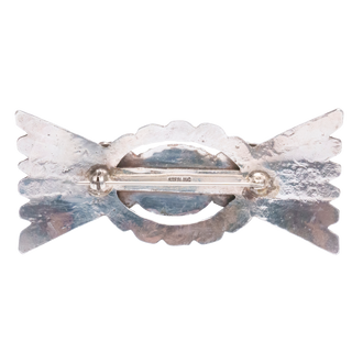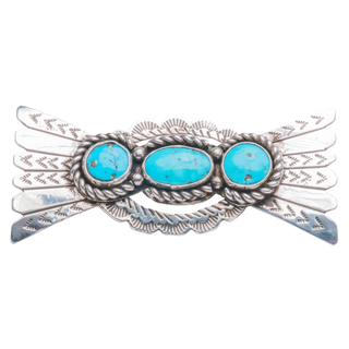 Revel in the sheer craftsmanship of this detailed sterling silver pin, handcrafted by the talented Navajo artisan Joelias Draper. This pin is more than just an accessory; it's a wearable work of art. With intricate hand-stamped details and three captivating Kingman turquoise stones set in oversized rope-style bezels, this pin adds a touch of Southwestern elegance to any outfit. Embrace the fusion of tradition and creativity, and wear a piece that tells a story of skilled artistry and timeless beauty.