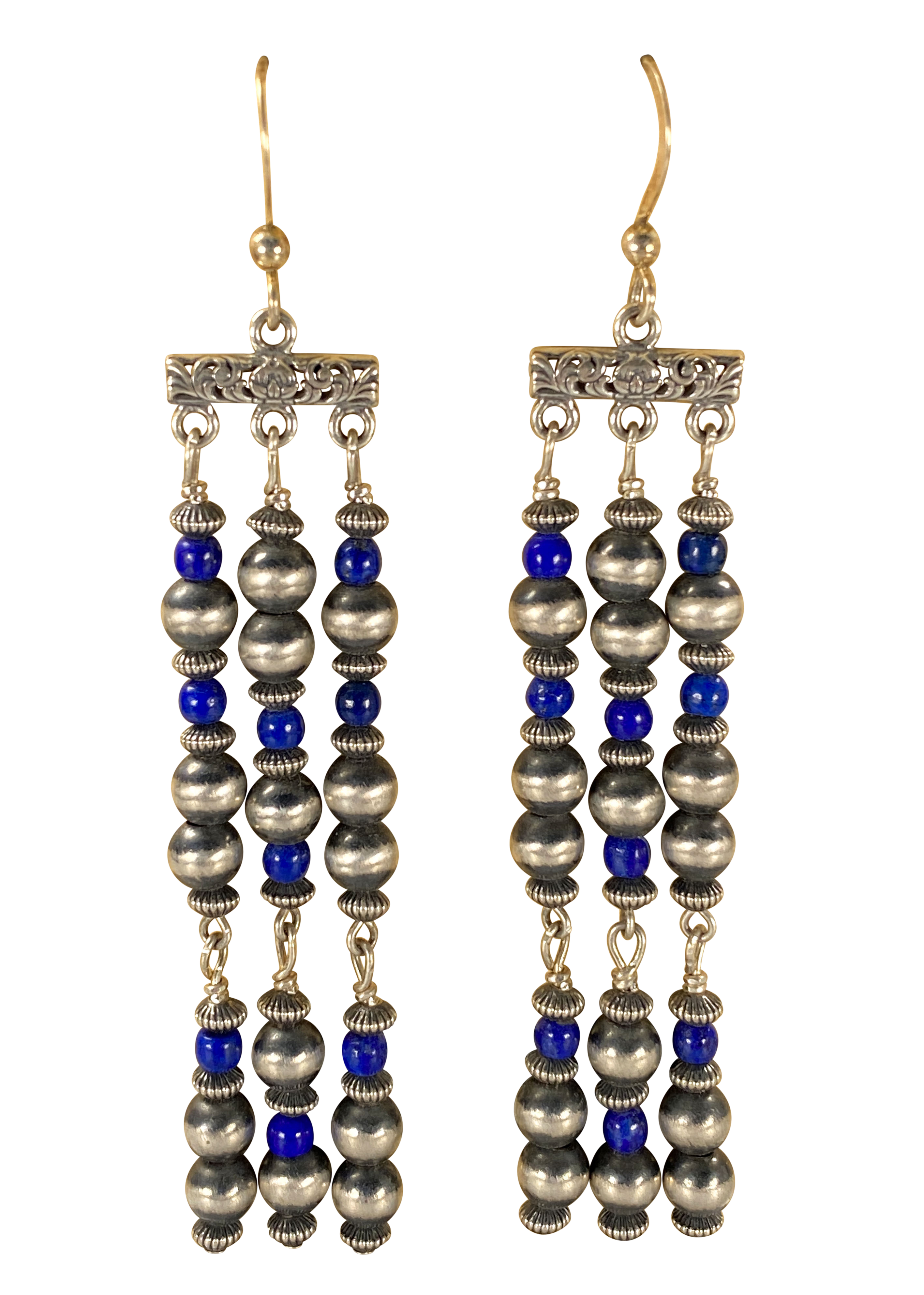 Deep blue lapis punctuate bright sterling silver Navajo Pearls in this stunning set of earrings. A long drop-length and multiple strands elevate these earrings' drama and add grace as they move with your wearer and frame your neck. With the lapis' deep blue hues reminiscent of night skies contrasted by traditional, bright sterling silver Navajo Pearls, these unforgettable earrings are bound to become a favorite.