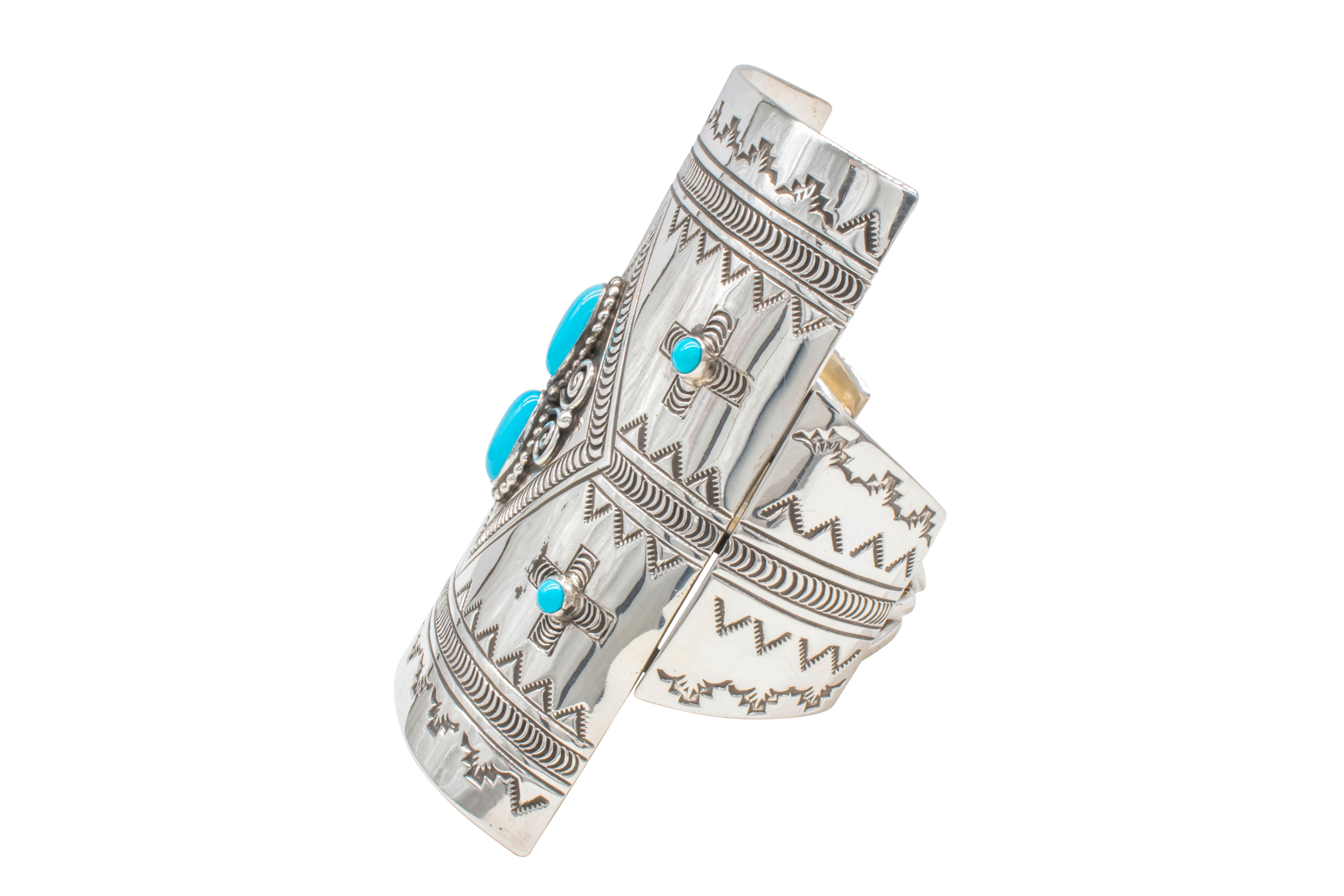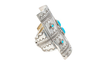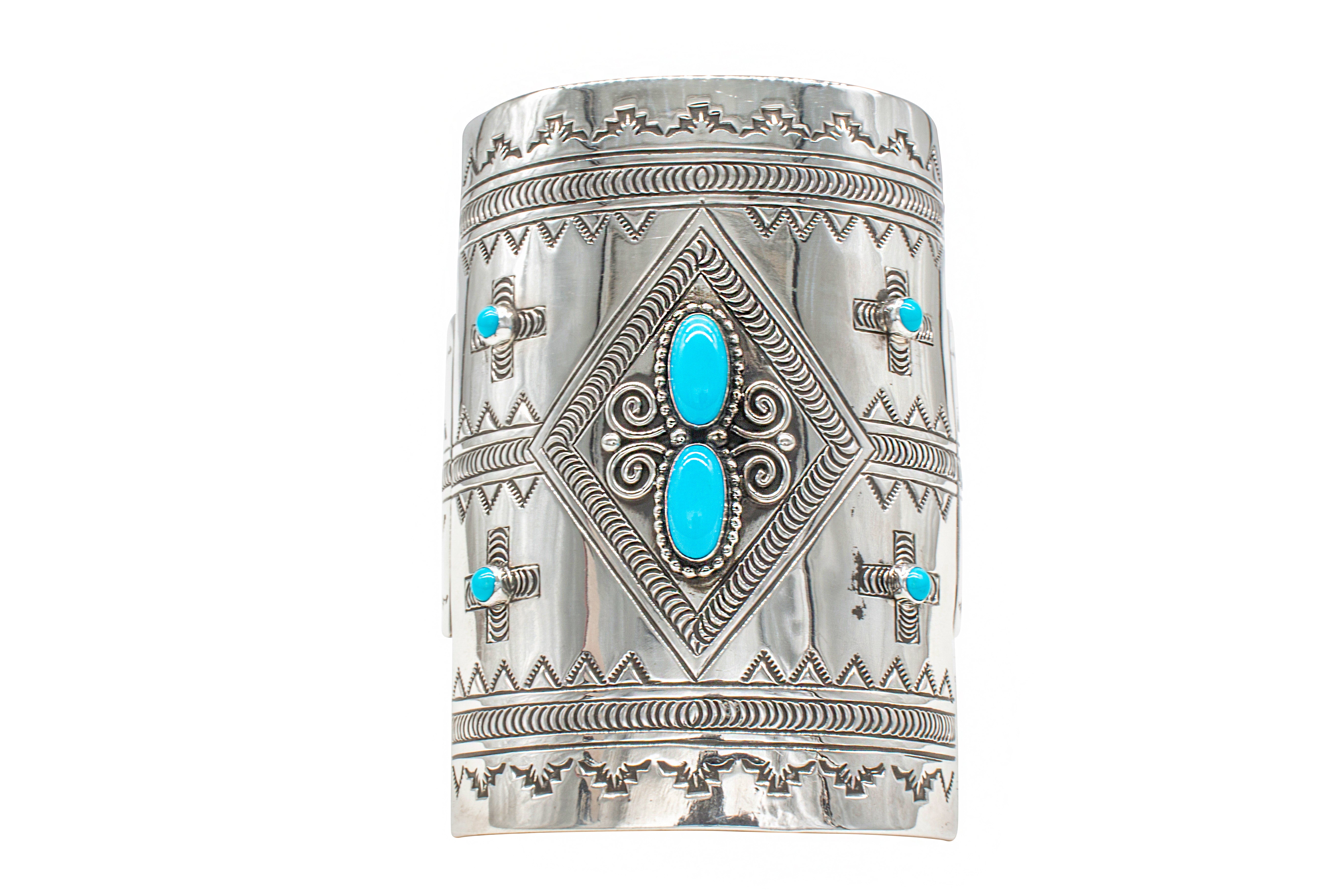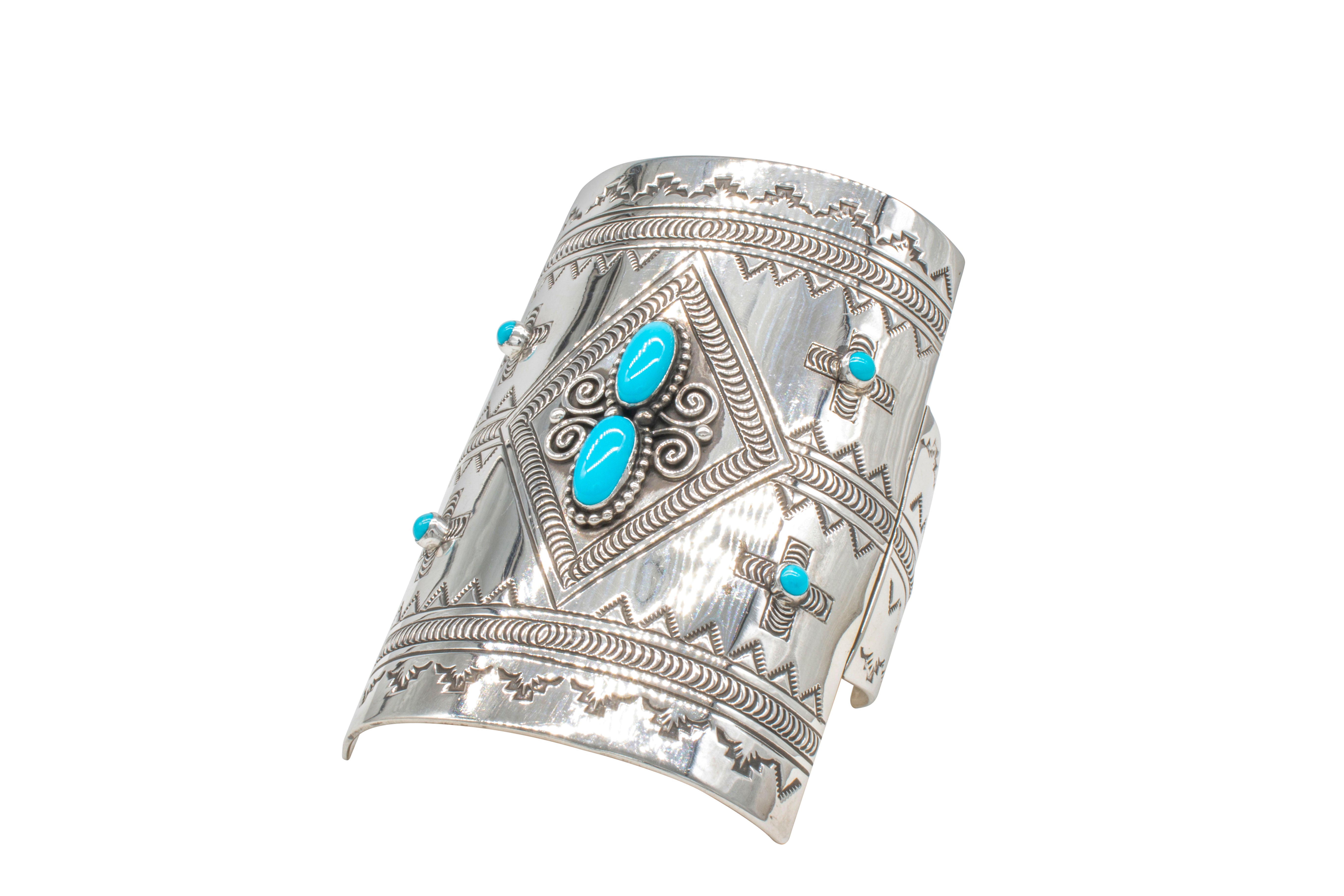 Gleaming silverwork and brilliant blue Sleeping Beauty Turquoise are a match made in heaven in this beautiful cuff by Lee Charley. Charley's eye for detail elvates every inch of this cuff while the carefully chosen turquoise stones create eye-catching pockets of blue amid the bright sterling silver. This is a piece for that can be dressed up or down to add a touch of Native American artistry to your outfit.