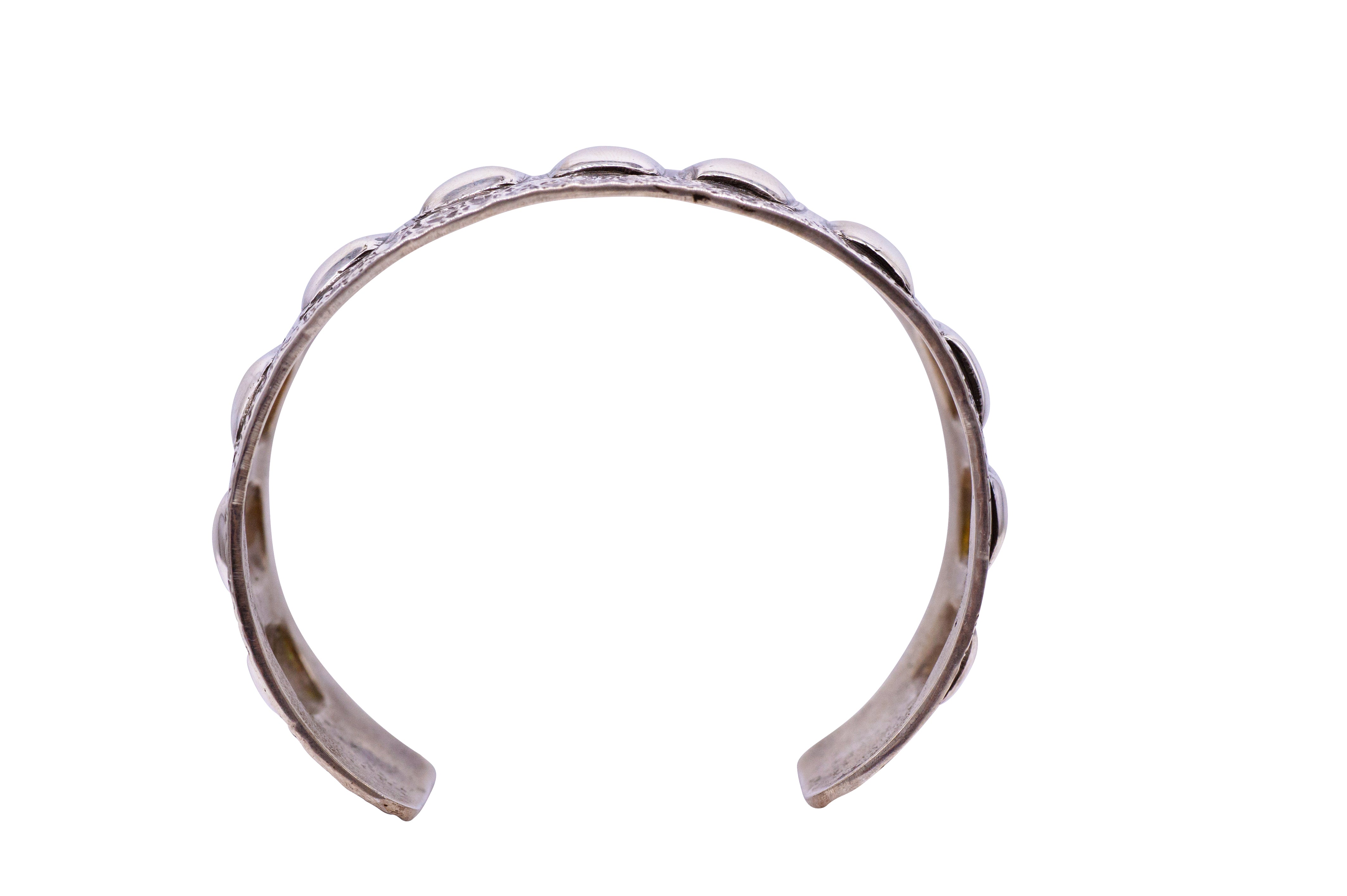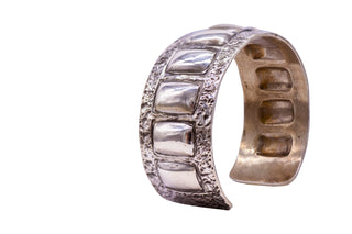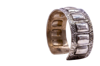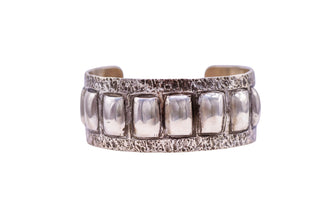 The artistry of Ronnie Willie shines in the carefully cast sterling silver of this bold cuff. Each geometric form is framed by the organic, crater-like texture that tufa casting is renowned for, creating an interplay of light and shadow. A contemporary creation rooted deeply in Navajo heritage, this piece is a stunning combination of past and present that can be dressed down or up to match any ocsasion.