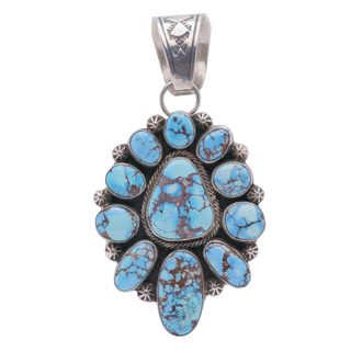 Golden Hills turquoise stones gleam from between intricate silver-work in this handcrafted pendant. The bright, robin's egg blue is bound to turn heads. This stunning piece also claims a stamped bail that adds yet another touch of detail.