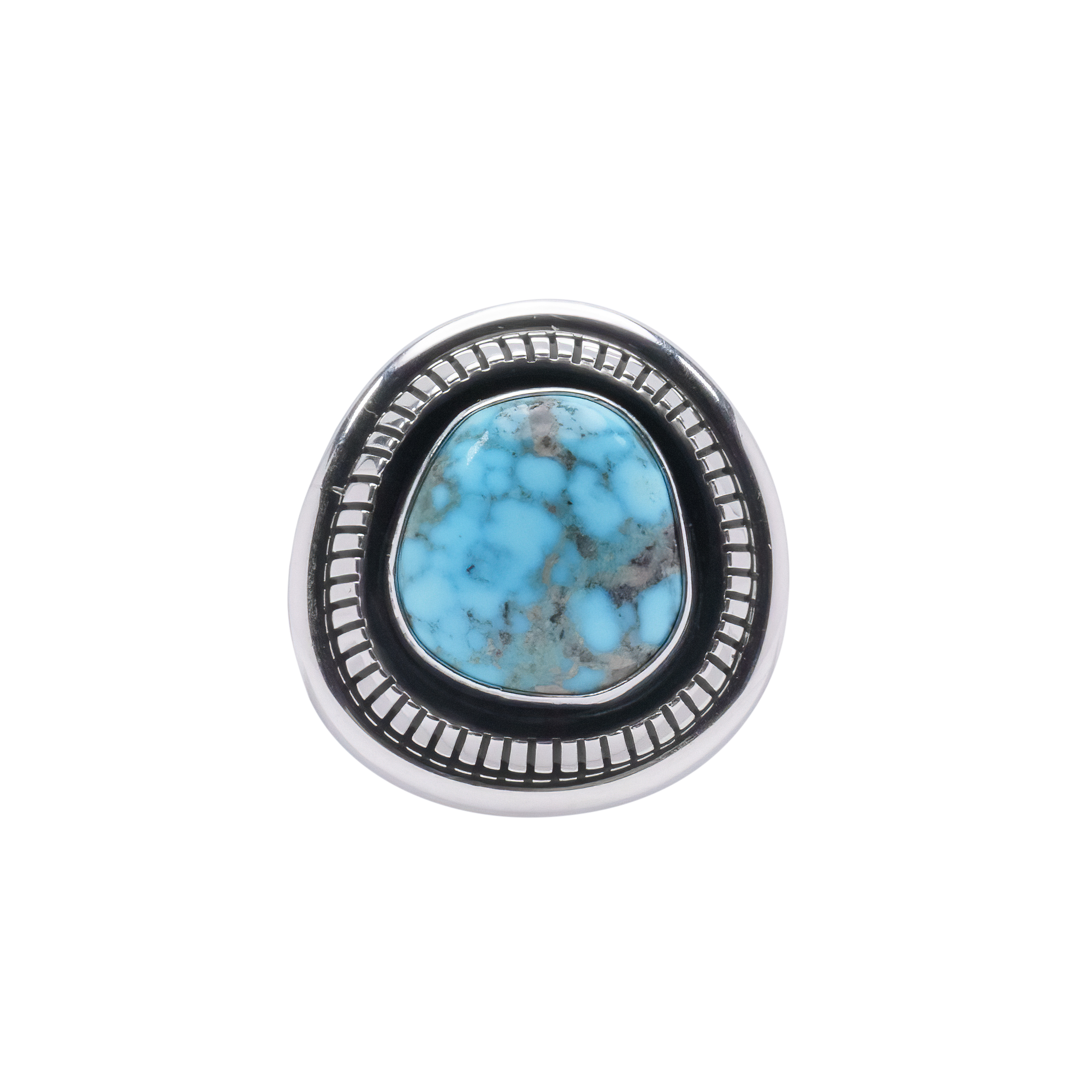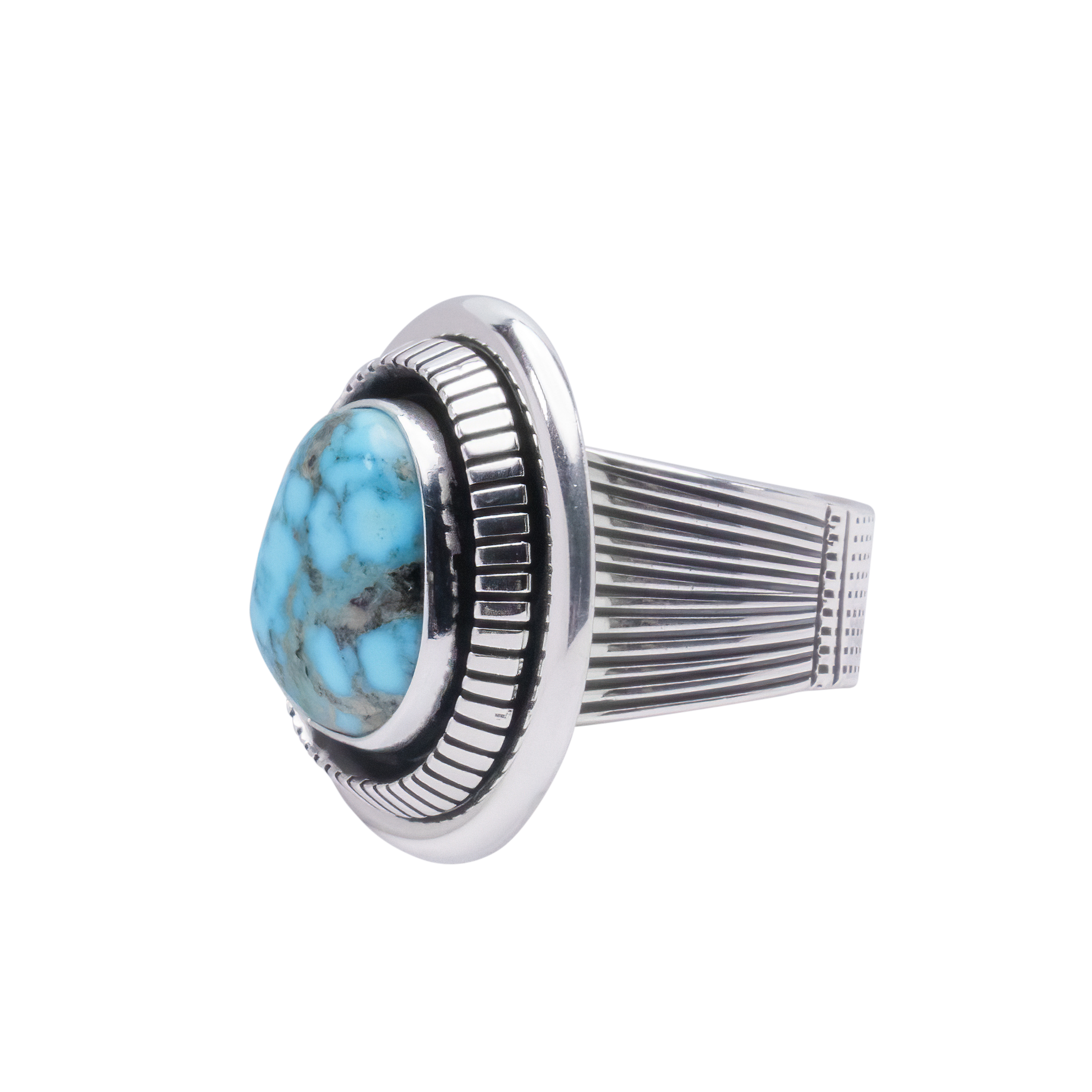 Bright blues Birdseye Kingman gleams from the center of this beautiful ring by artisan Marian Nez. A result of masterful artistic vision, shapes and slants guide eyes along this ring's brilliant construction. A true piece of art, this small ring makes a loud statement.
